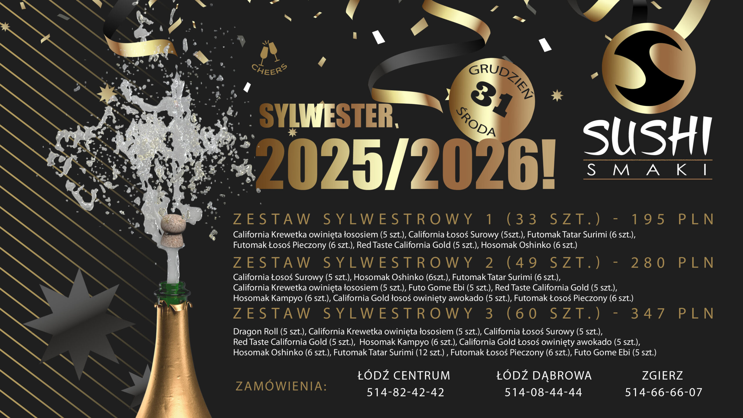 10x California Gold Krewetka owinięta łososiem, 10x California krewetka w tempurze, 6x BlackRoll Shrimp&Bacon, 6x Futomak krewetka w tempurze,6x Hosomak ogórek, 6x Hosomak krewetka